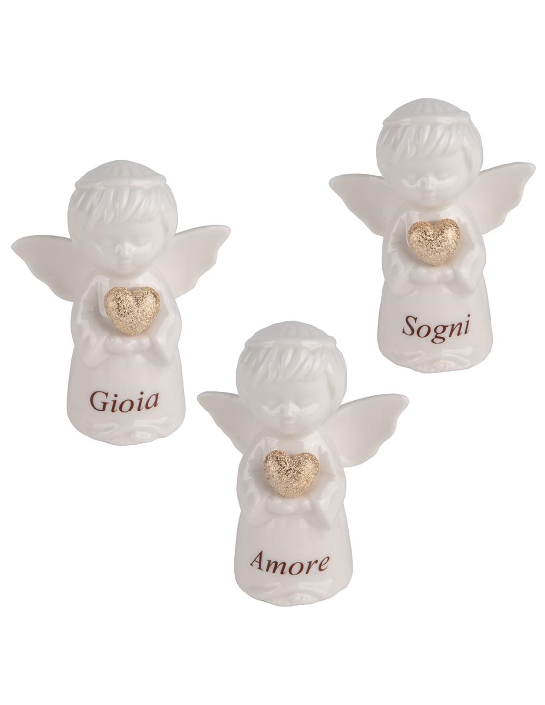 Angioletto in porcellana bianco e oro. E' alto 8 cm perfetto per molte occasioni. E' decorato dalle scritte "gioia", "amore", "sogni". Il prezzo si riferisce alla confezione da 3 pezzi assortiti.
