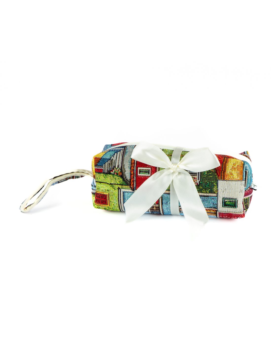 Astuccio porta confetti con casette colorate. Dotato di cerniera e manico. Prodotto in Italia.