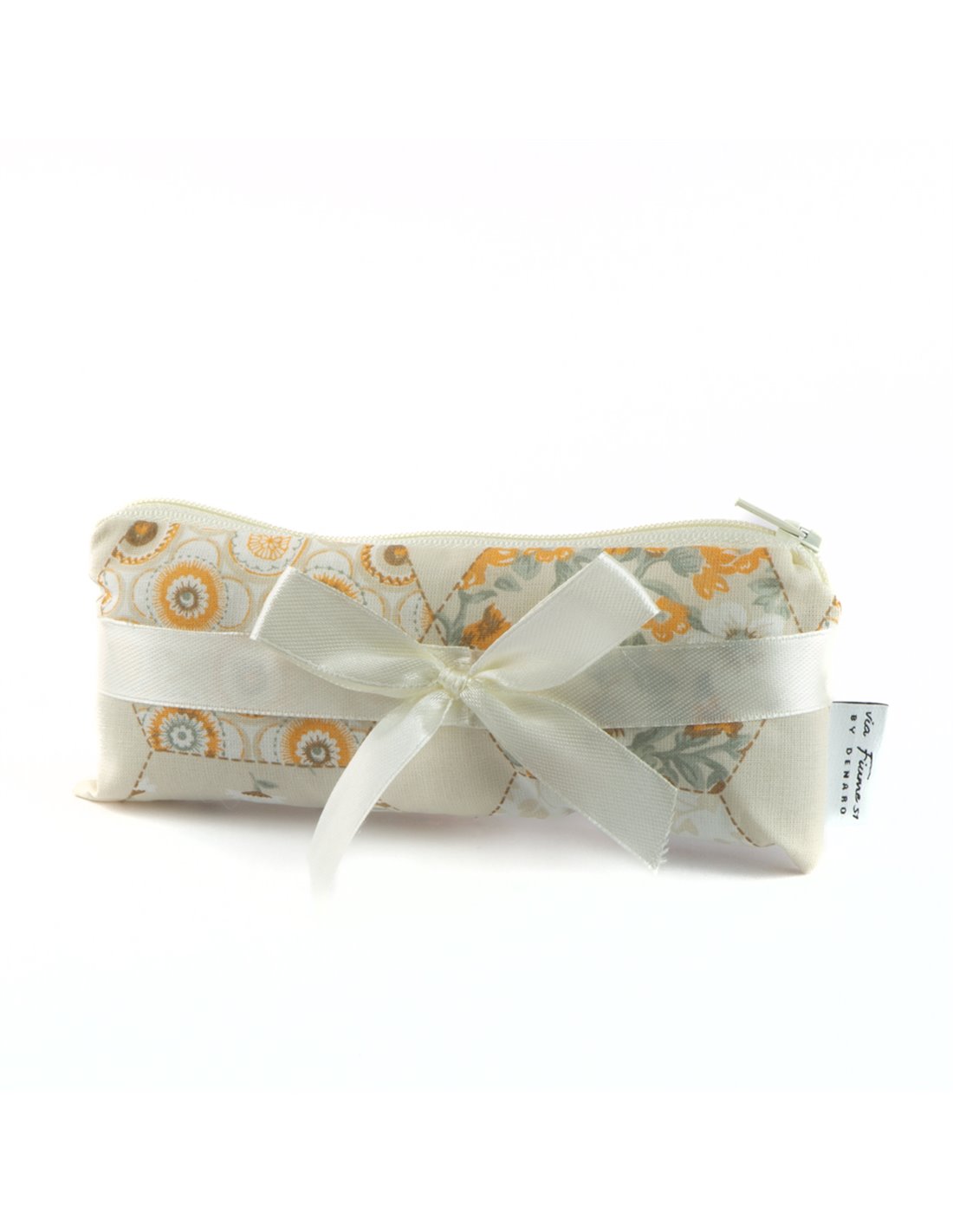 Piccolo astuccio Spring con cerniera. Impreziosito da vari disegni floreali arancioni e verdi su uno sfondo beige; questa combinazione di colori lo rende un pensiero delicato ma simpatico. Made in Italy. Il prezzo si riferisce alla confezione da 10 pezzi.