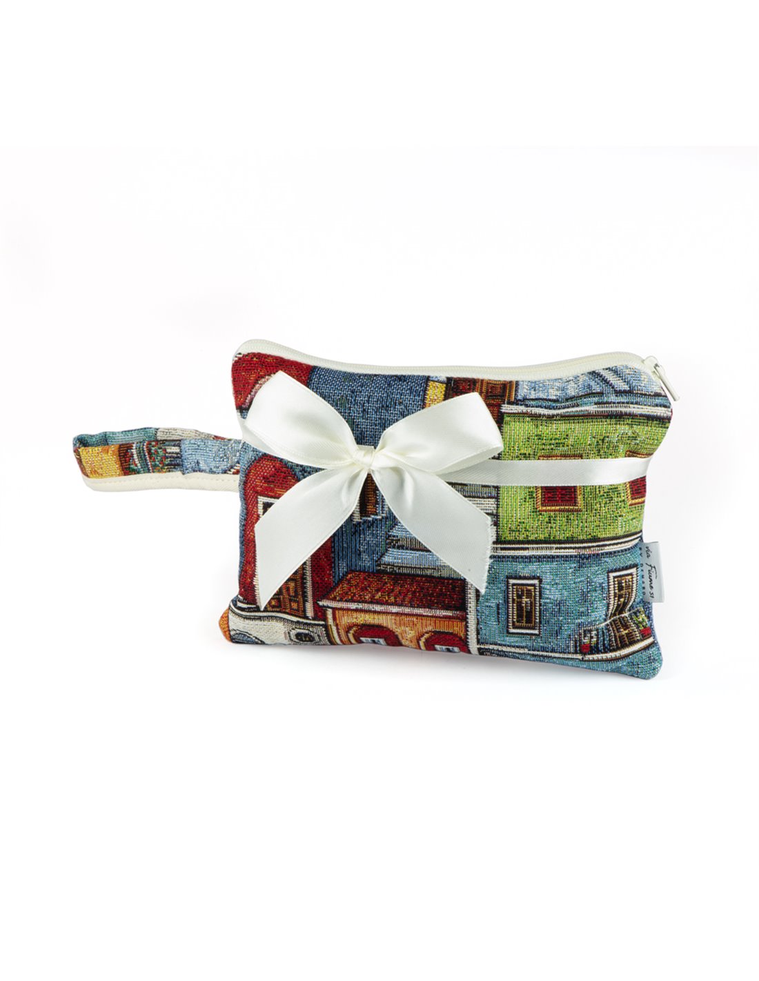 Beauty rettangolare con manico e cerniera. L'articolo è decorato con casette colorate. Prodotto in Italia.