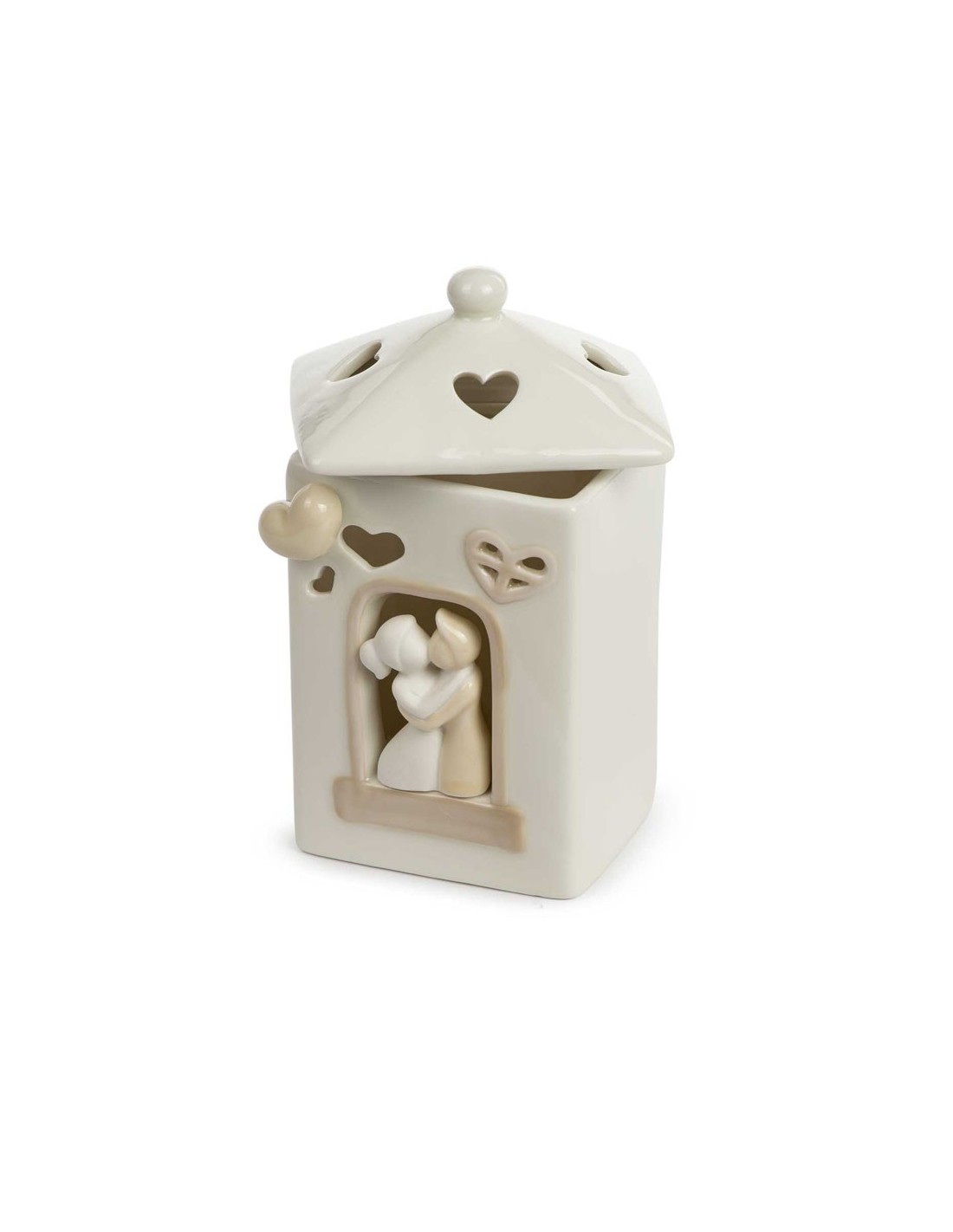 La bomboniera casetta con led in ceramica con coppia di innamorati grande e' ideale come bomboniera per matrimonio e altri eventi ed e' anche utilizzabile come articolo da regalo.
