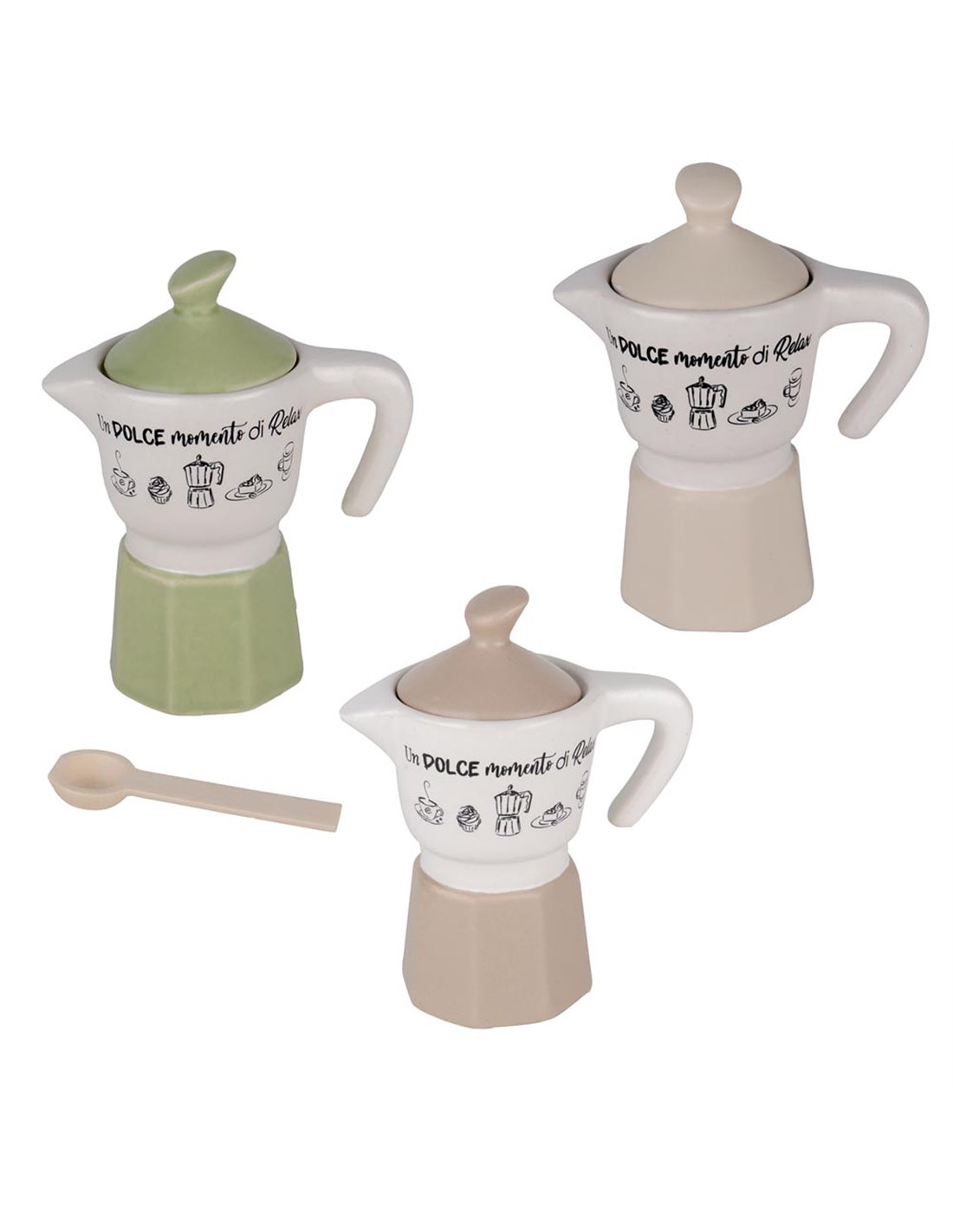 Bomboniera zuccheriera a forma di moka in 3 colori assortiti, con cucchiaino in legno. La caffettiera è decorata con la scritta "Un dolce momento di relax" ed è alta 11 cm, perfetta come bomboniera matrimonio o anniversario. Il prezzo si riferisce alla confezione da 3 pezzi assortiti.