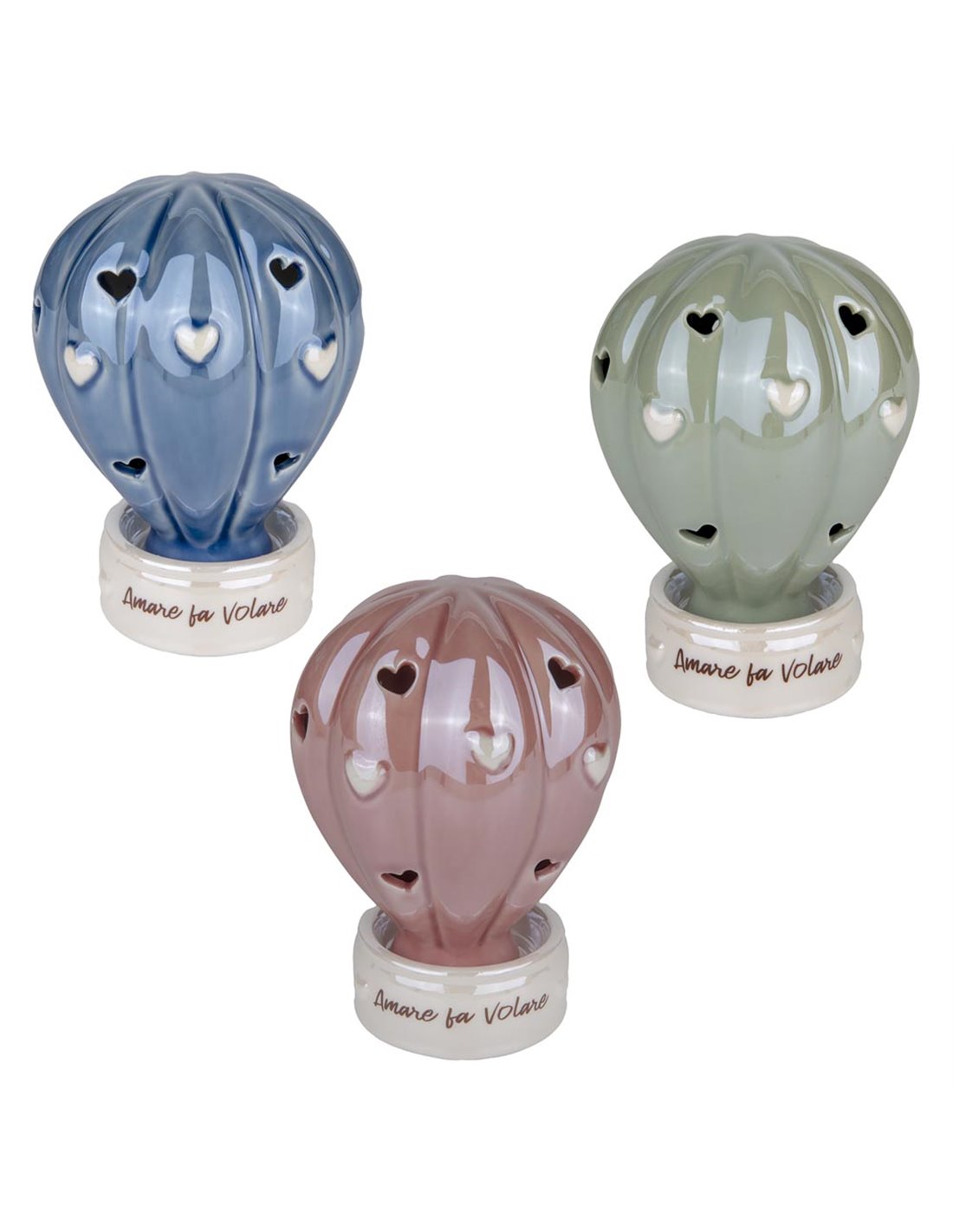 Bomboniera a forma di mongolfiera illuminata da led in 3 colori assortiti. La mongolfiera è alta 12 cm e la troviamo in celeste, verde e rosa. Il prezzo si riferisce alla confezione da 3 pezzi assortiti.