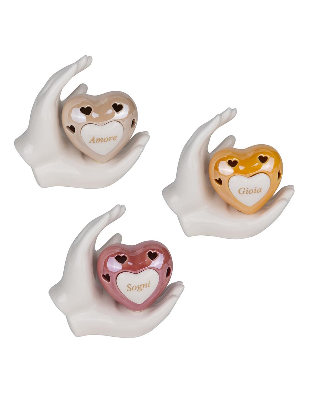 Bomboniera a forma di cuore con dolce pensiero racchiuso tra le mani in 3 colori assortiti: tortora, arancione e rosso. I cuori sono dotati di led e troviamo le scritte "amore", "gioia", "sogni". Il prezzo si riferisce alla confezione da 3 pezzi assortiti.