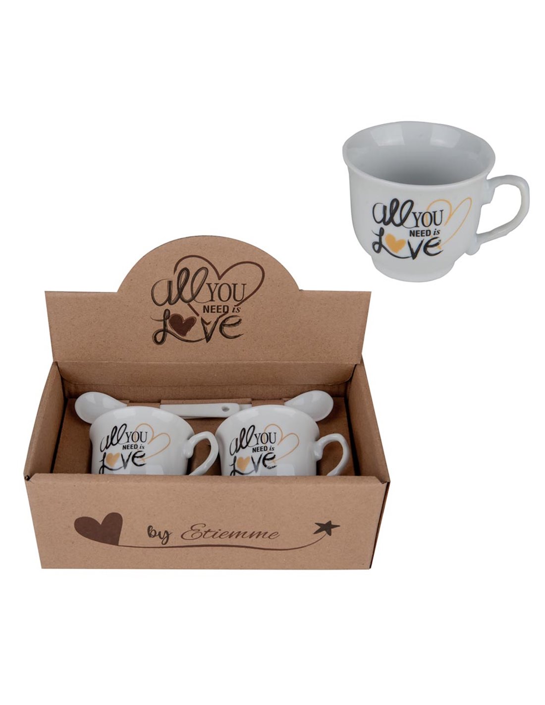 Bomboniera con set da 2 tazzine da caffè e 2 cucchiaini. Le tazzine sono decorate con la scritta "all you need is love". Il set è compreso di scatola regalo. Una bomboniera semplice, sempre gradita e molto utile.