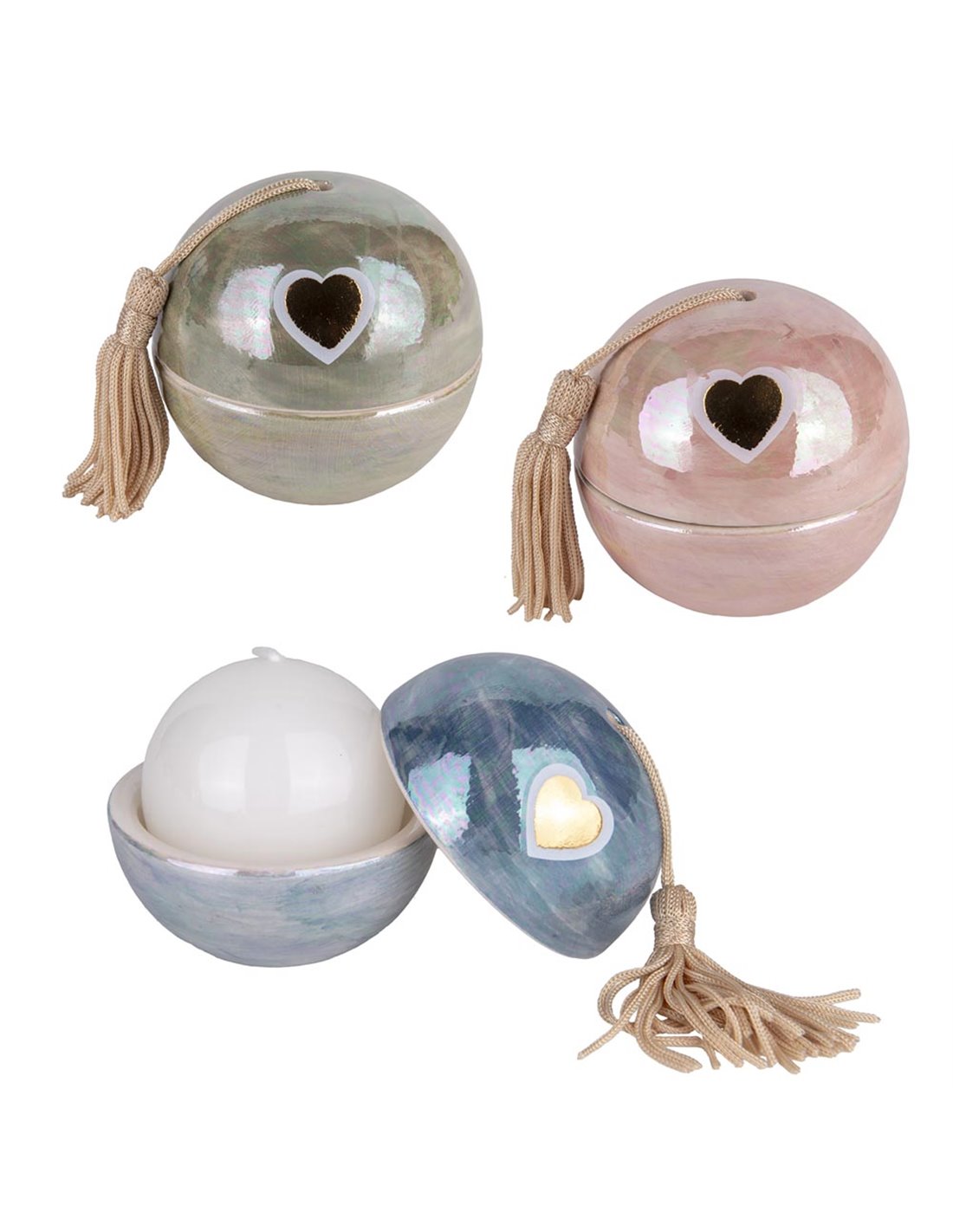 Bomboniera sferica con candela in 3 colori assortiti. Ha un diametro di 7 cm e la troviamo in verde, rosa e celeste. E' decorata da un piccolo cuore centrale. Il prezzo si riferisce alla confezione da 3 pezzi assortiti.