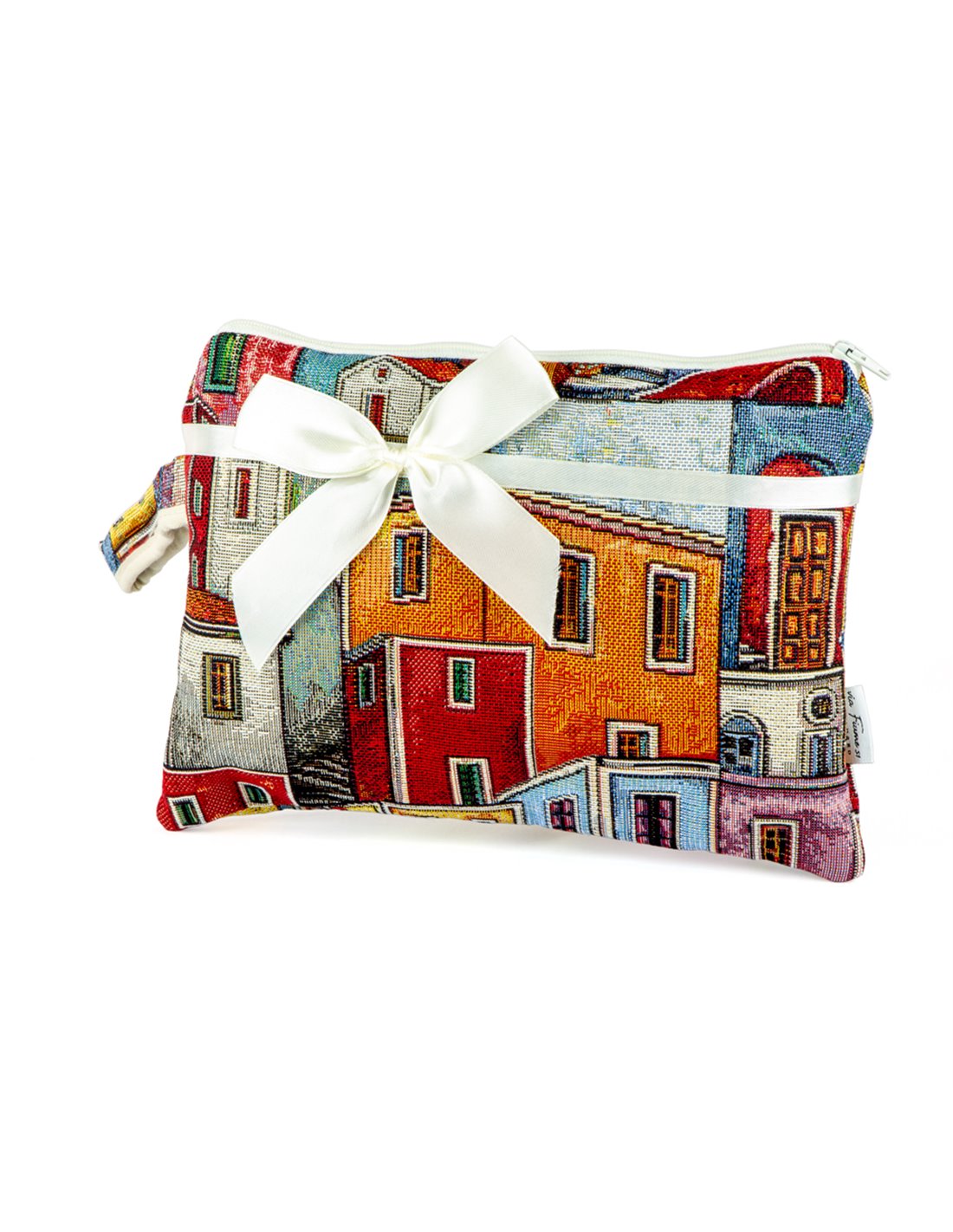 Bomboniera vanity con cerniera e manico. Decorata con casette colorate. Made in Italy.