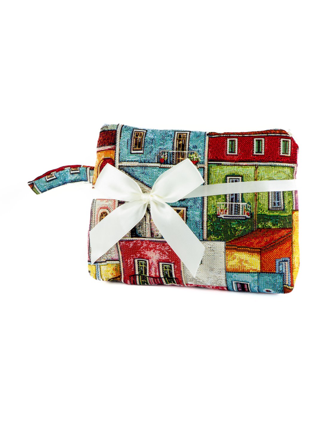 Bomboniera necessaire con cerniera. Decorato con casette colorate. Made in Italy.