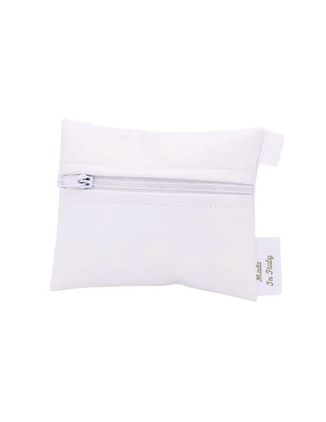 Bustina bianca in pelle con zip. Il prezzo si riferisce alla confezione da 10 pezzi.