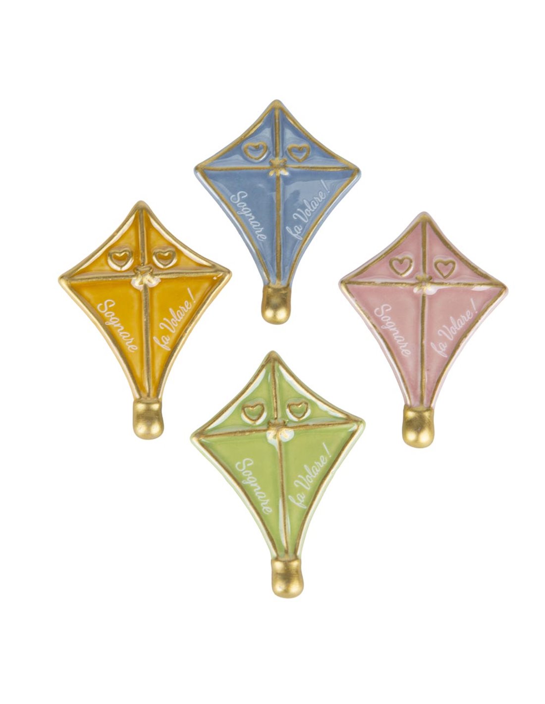 Bomboniera a forma di aquilone con magnete, in 4 colori assortiti. E' alta 7 cm e la troviamo in giallo, celeste, rosa e verde. E' decorata con la scritta "sognare fa volare". Dotata di box in PVC. Il prezzo si riferisce alla confezione da 4 pezzi assortiti.