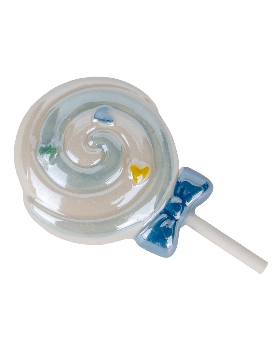 Bomboniera calamita lecca lecca celeste e con scatola in PVC. Il lecca lecca è alto 8 cm e presenta diversi cuoricini come decorazione. Una bomboniera dolce ideale per un battesimo bimbo.