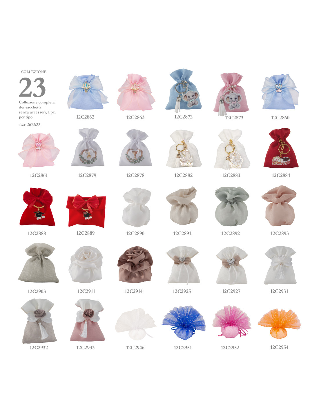 Le nostre collezioni ti permettono di avere l'assortimento di tutti i nostri sacchettini portaconfetti della nuova Collezione Bomboniere 2026. Acquista la collezione sacchetti che preferisci ad un prezzo imperdibile, La Collezione Mix è composta da 1 sacchetto per tipo ed il prezzo si riferisce alla composizione da 29 sacchetti.