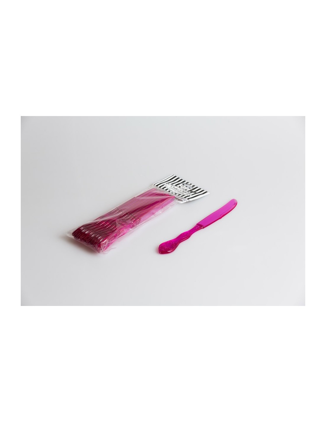 Coltelli in plastica decorata fucsia. La linea è disponibile in diversi colori da abbinare ai bicchieri per una festa colorata e allegra.