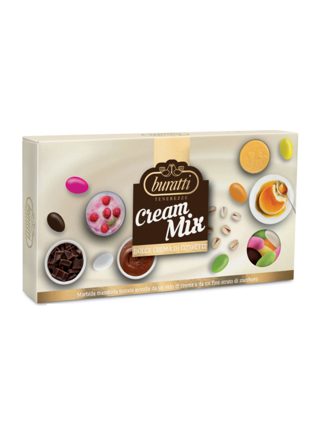 Confetti Tenerezze Buratti Mix Cream colorati arancione, bianco, fuxia, giallo, marrone e verde. Ogni colore ha un gusto e la selezione di gusti sono Cioccolato bianco, Crème caramel, Pistacchio, Cioccolato fondente, Zabaione, Gianduja e Zuppa inglese. Confezione da 1 Kg