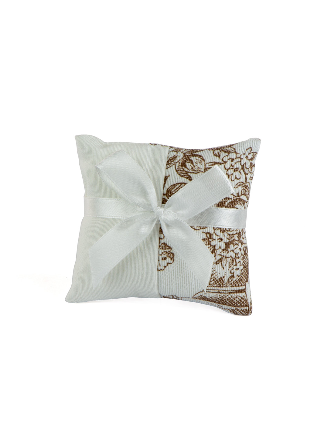 Bomboniera a forma di cuscino bianca e beige in versione piccola. Prodotto in Italia. Il prezzo si riferisce alla confezione da 10 pezzi.