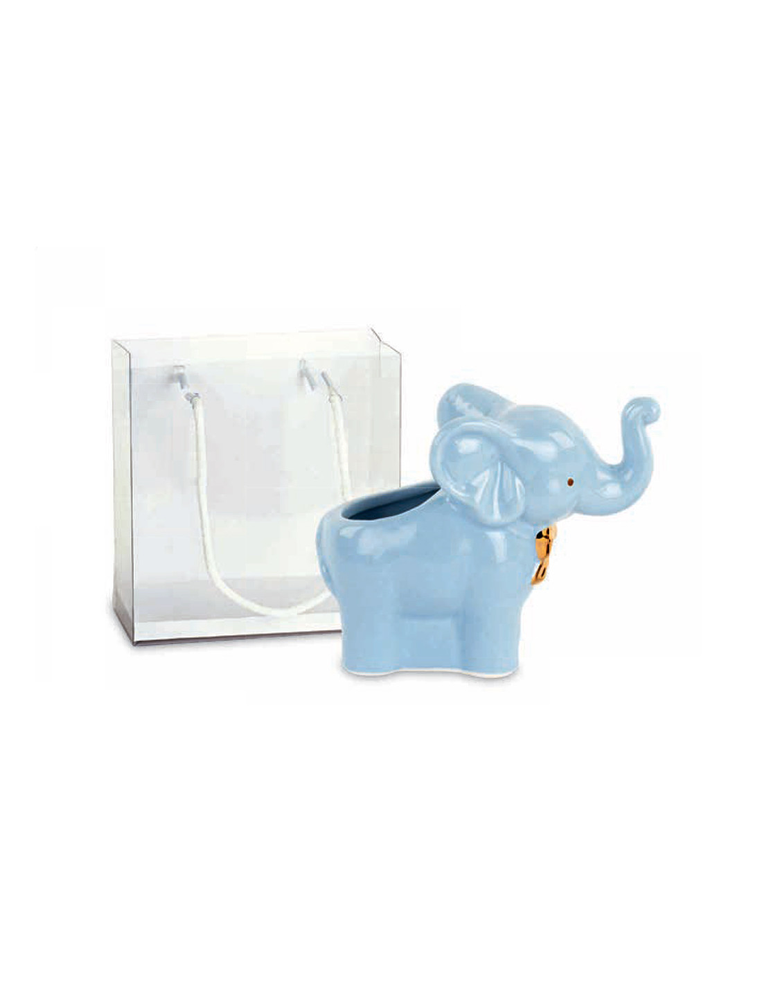 Cachepot a forma di elefantino azzurro. Perfetto come portavaso ed ottimo da regalare per un battesimo bimbo. E' compreso di shopper.