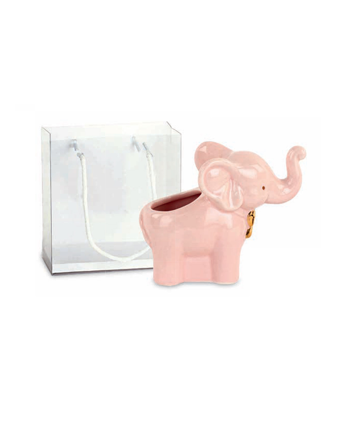 Cachepot a forma di elefantino rosa. Perfetto come portavaso ed ottimo da regalare per un battesimo bimba. E' compreso di shopper.