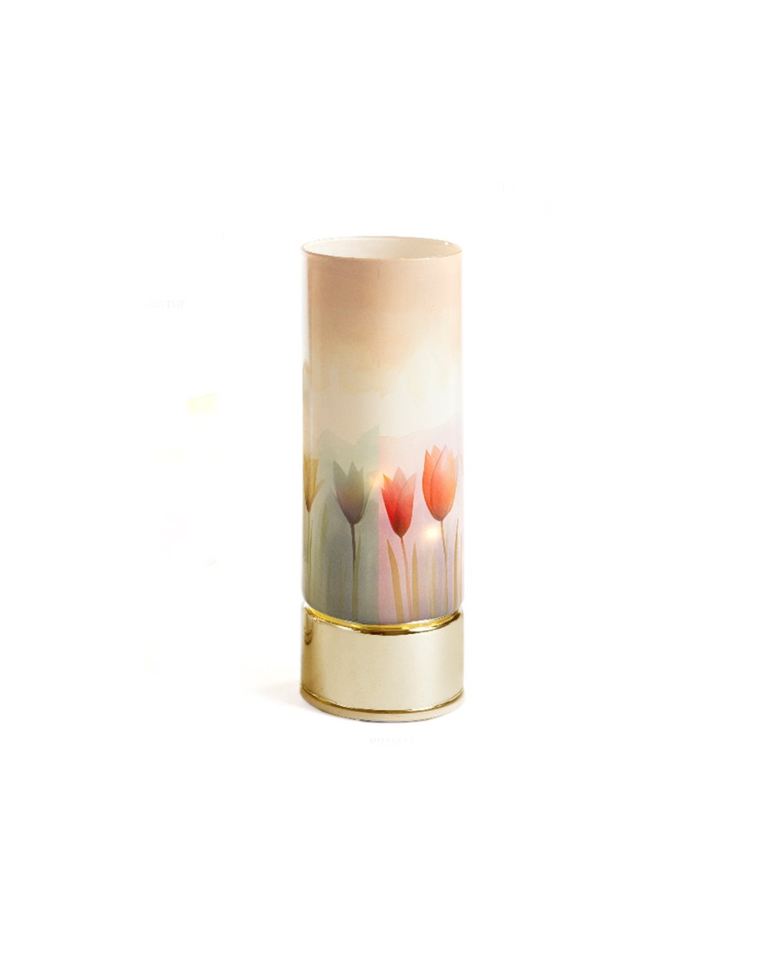 Lampada cilindrica con movimento rotante su base dorata. Paralume in vetro decorato con tulipani colorati, la lampada calda e accogliente quando accesa. E' una bomboniera originale per matrimonio e altri eventi esclusivi.