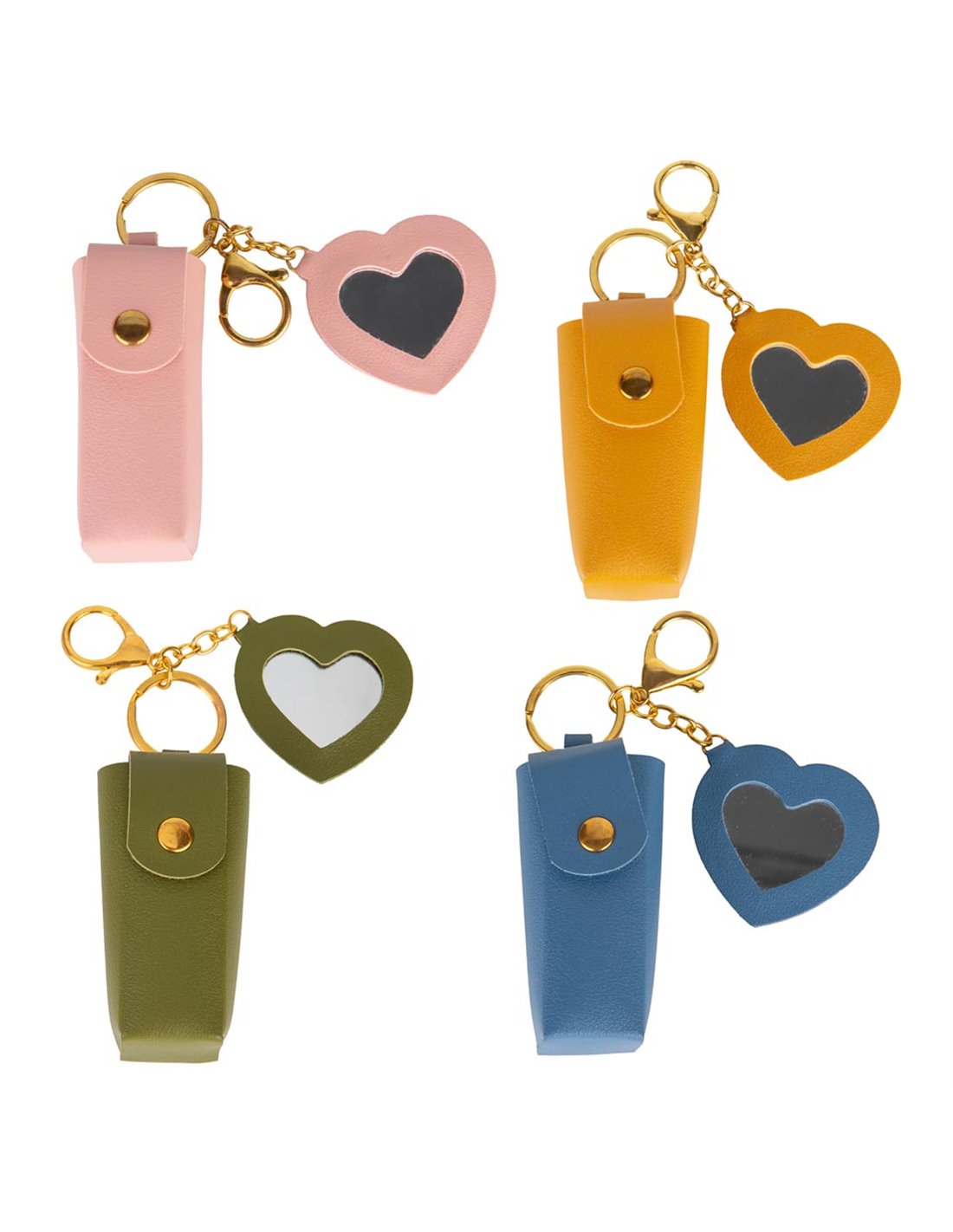 Portachiavi colorato con tasca e specchio a forma di cuore. Alto 8 cm. Lo troviamo in rosa, arancione, verde e blu. Il prezzo si riferisce alla confezione da 4 pezzi assortiti.