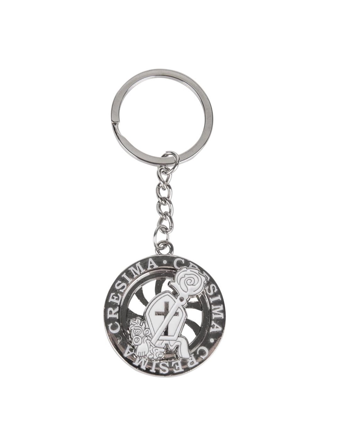 Portachiavi in metallo argento decorato con mitria e bastone papale e la scritta cresima. Diametro di 4 cm.