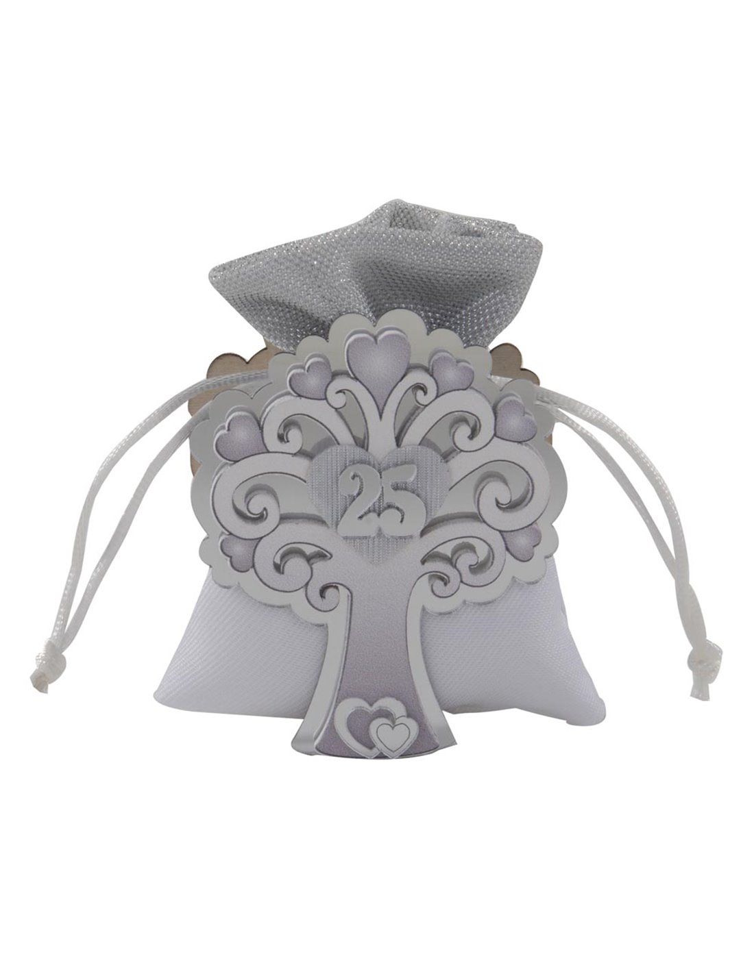 Portaconfetti in legno decorato 25° anniversario. Ideale per nozze d'argento; è un albero della vita decorato e diversi cuori. Ha inoltre un sacchetto argento con tirante. Il prezzo si riferisce alla confezione da 6 pezzi.