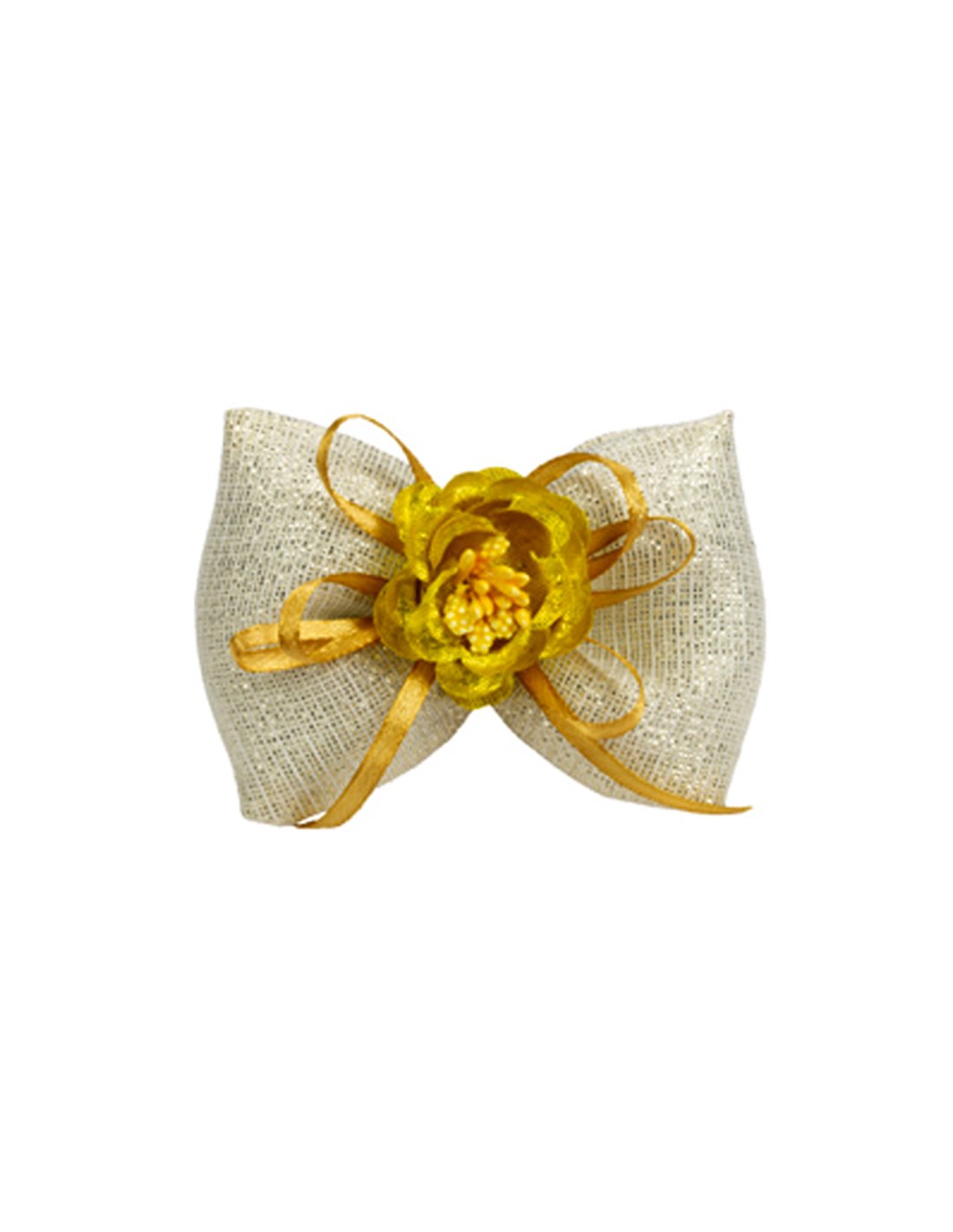 Sacchetto bomboniera a forma di fiocco in tessuto lux oro. Nastri, fiori, ed altri complementi sono indicativi e non sono compresi. Si possono trovare nelle relative categorie. Il prezzo si riferisce alla confezione da 10 pezzi.