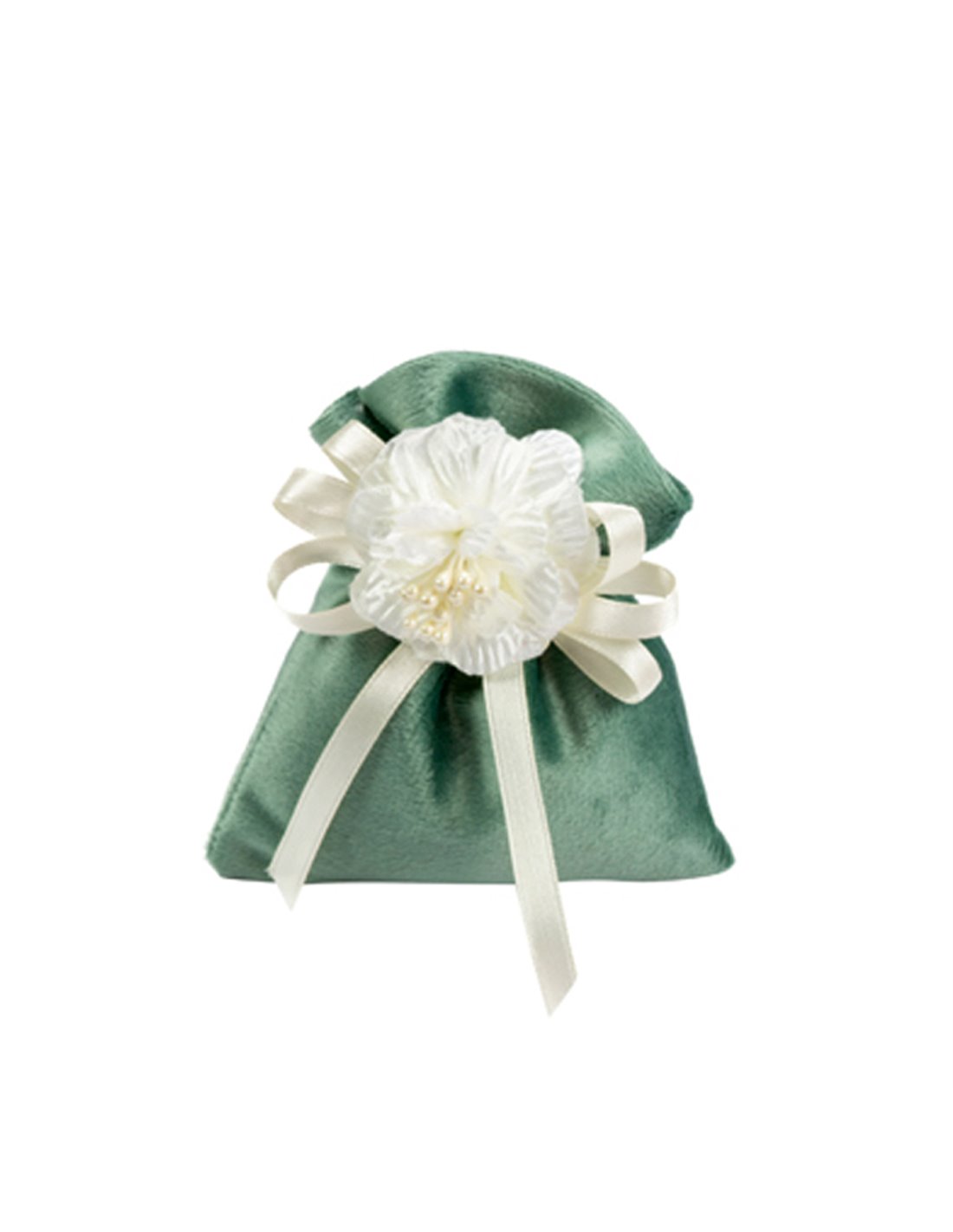 Sacchetto bomboniera in velluto verde salvia. Perfetta per vari tipi di eventi grazie al suo colore molto delicato. Nastri, fiori, ed altri complementi sono indicativi e non sono compresi. Si possono trovare nelle relative categorie. Il prezzo si riferisce alla confezione da 10 pezzi.