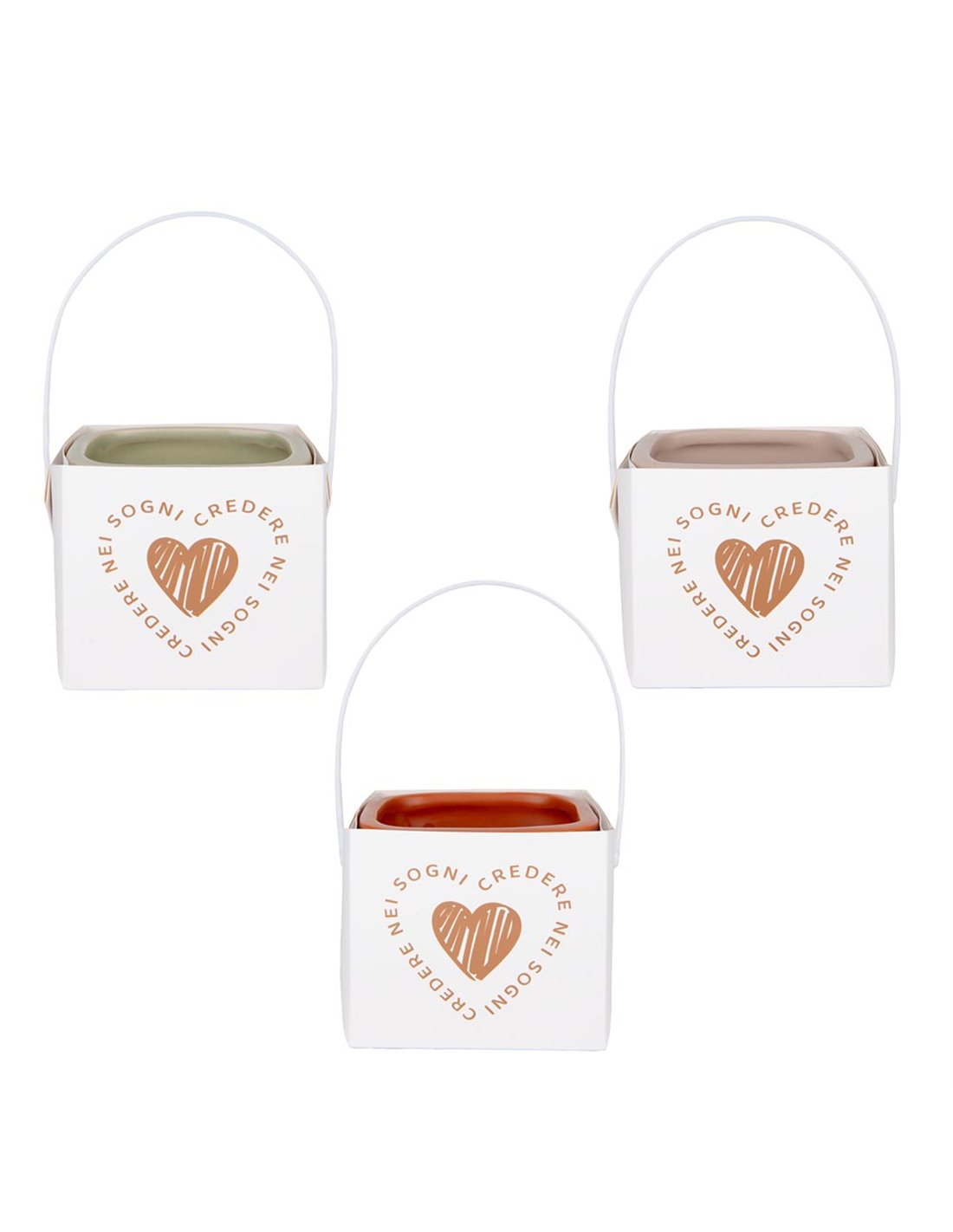 Portapiante in porcellana in 3 colori assortiti. Ha una larghezza di 10 cm ed è alto 8 cm. E' decorato dalla scritta "credere nei sogni" e lo troviamo in verde, rosa e rosso. E' compresa di gift bag con manici. Il prezzo si riferisce alla confezione da 3 pezzi assortiti.