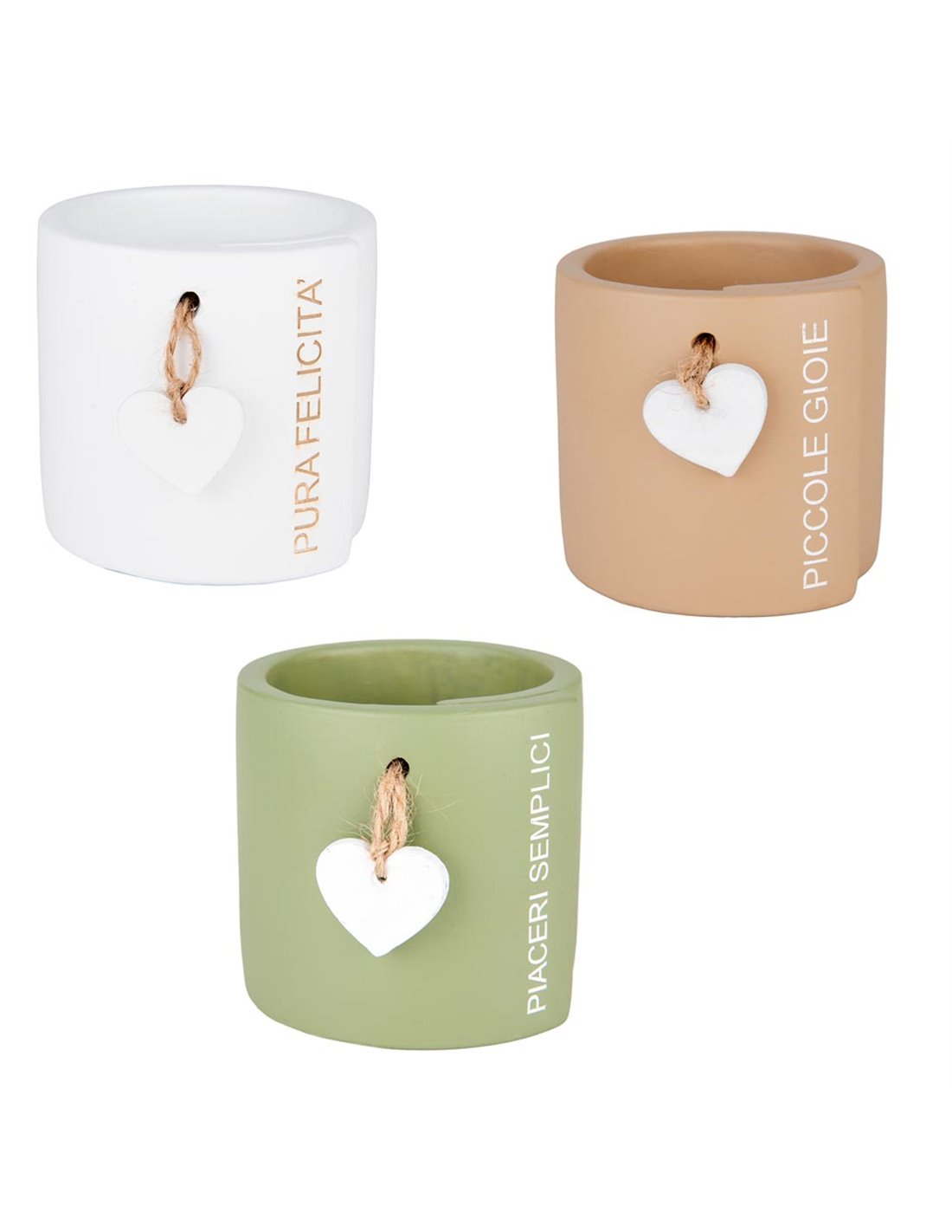 Portapiante con cuore e frase in 3 colori assortiti. Ha un diametro di 7 cm ed è alto 7 cm. E' decorata dalle scritte "pura felicità", "piccole gioie", "piaceri semplici". Lo troviamo in bianco, rosa e verde. Il prezzo si riferisce alla confezione da 3 pezzi assortiti.