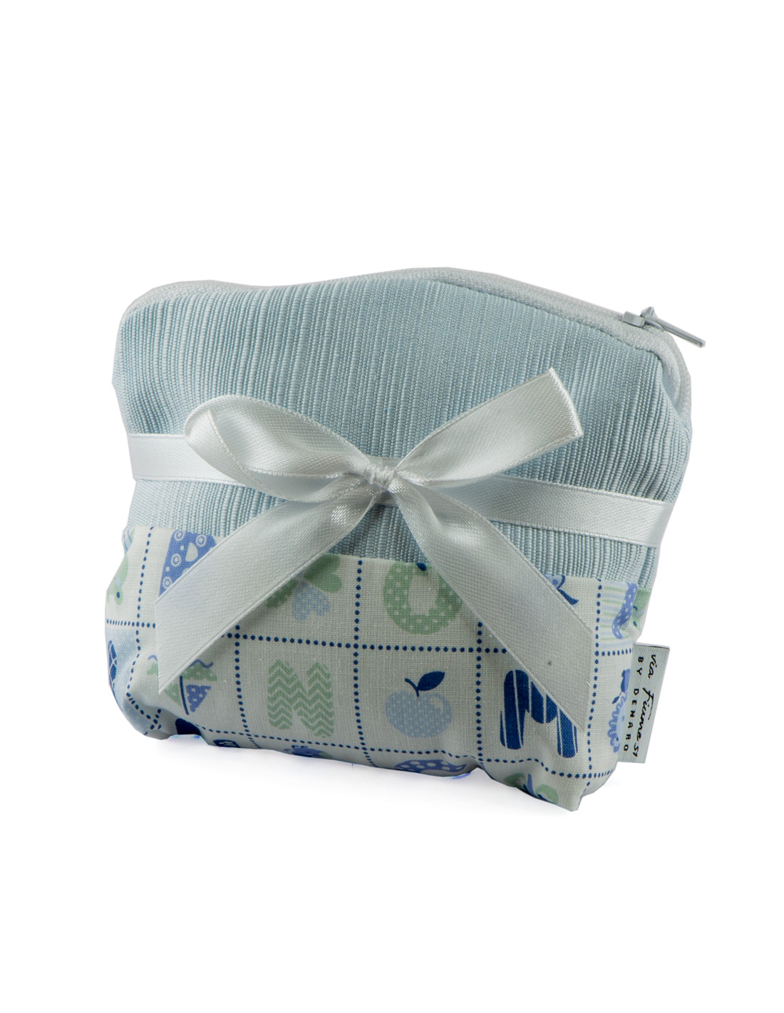 Sacchettino con cerniera celeste. Varie decorazioni con animaletti, lettere e stelle. Ideale per battesimo bimbo. Made in Italy. Il prezzo si riferisce alla confezione da 10 pezzi.