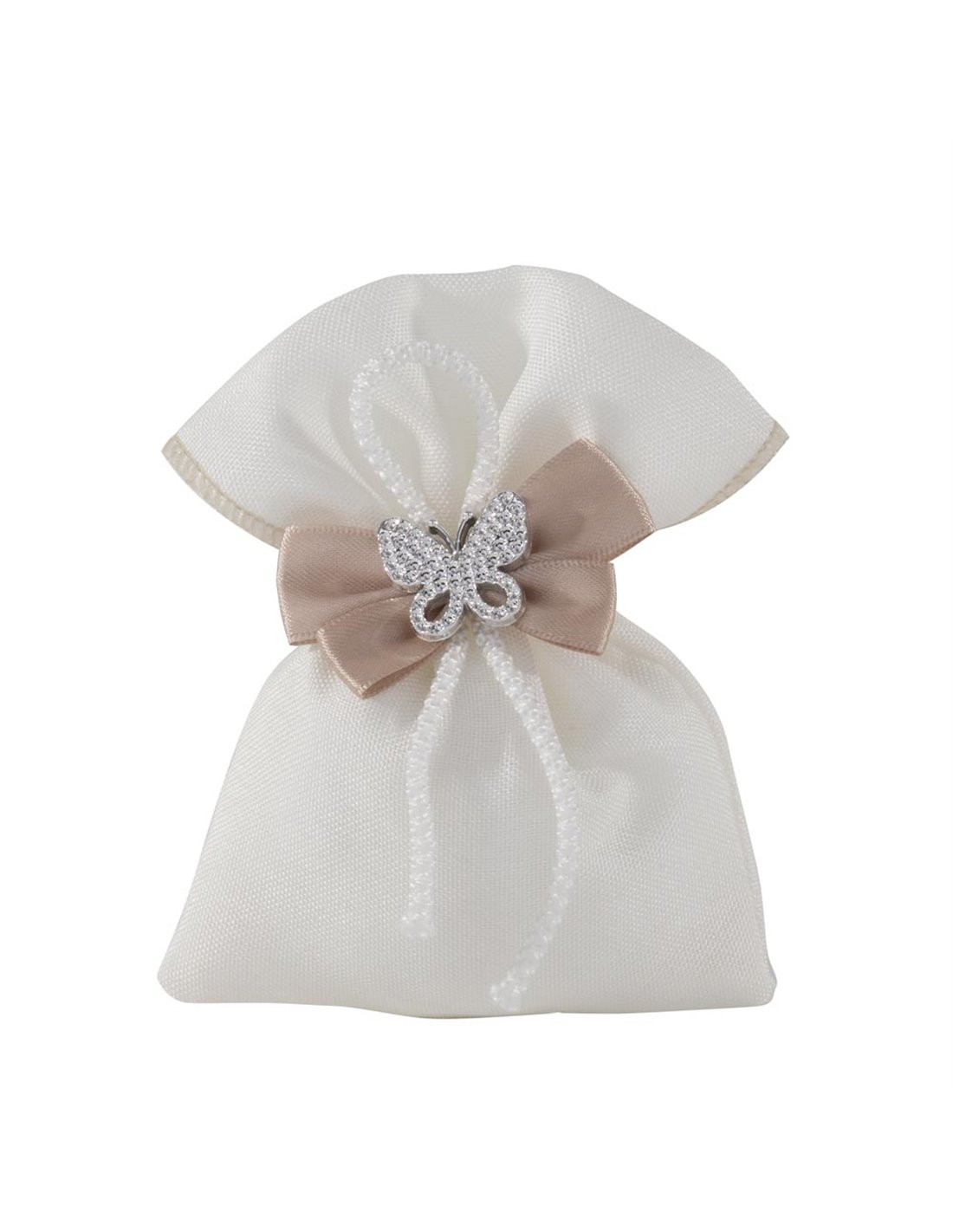 Sacchettino portaconfetti bianco compreso di fiocco tortora e applicazione farfalla con strass. Il prezzo si riferisce alla confezione da 12 pezzi.