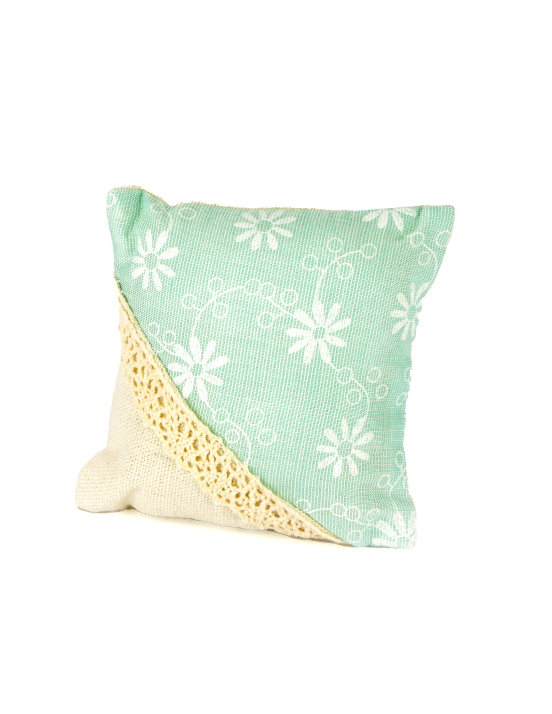 Sacchetto a forma di cuscino con tasca portaconfetti nel retro. Il sacchetto bomboniera è in tessuto color panna e tiffany a fantasia floreale con un applicazione nastro in tombolo.