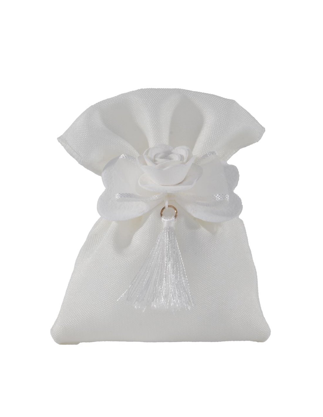 Sacchettino bomboniera bianco compresa di rosa e nappina bianca. Una bomboniera semplice, ma elegante e raffinata allo stesso tempo. Il prezzo si riferisce alla confezione da 12 pezzi.