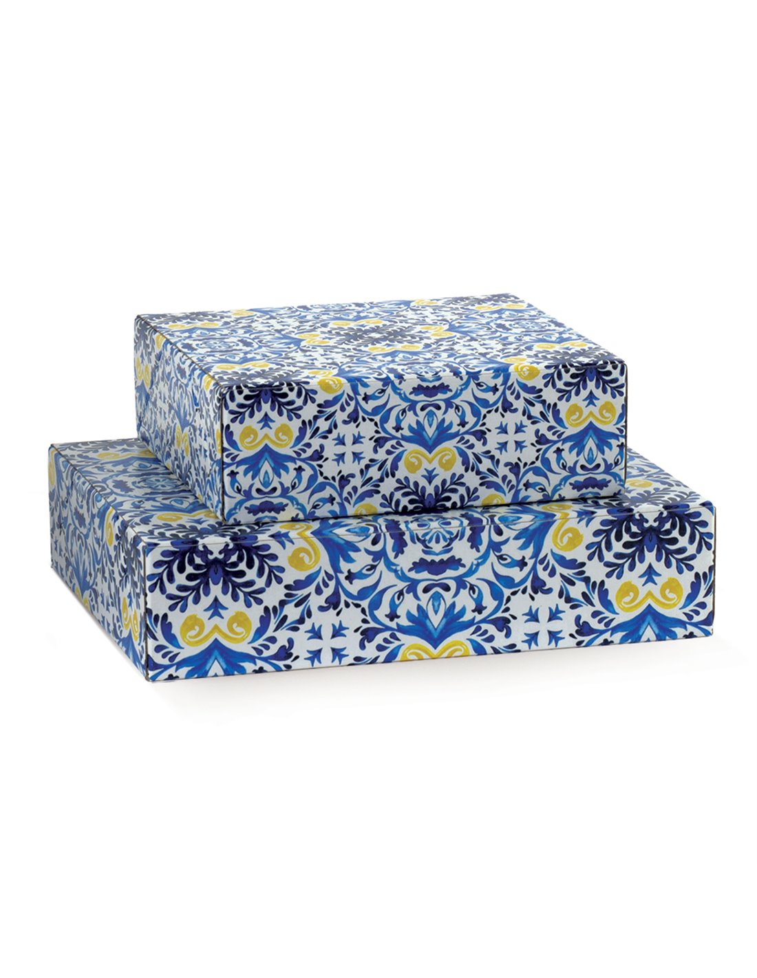 Scatola Maioliche pasticceria versione grande. Dotata di varie decorazioni in blu, bianco e giallo.