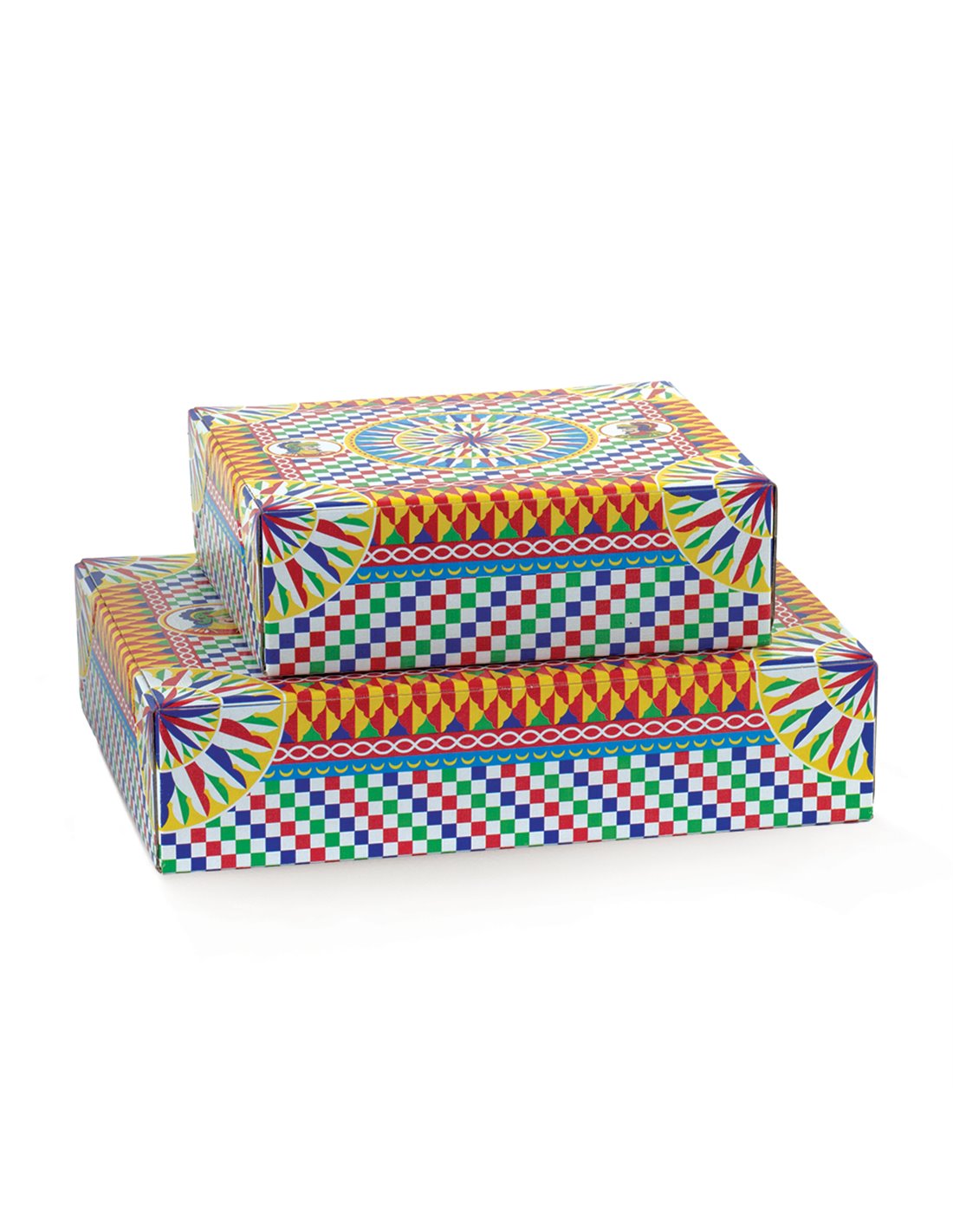 Scatola pasticceria Mediterraneo versione piccola. Ornata con varie fantasie colorate.