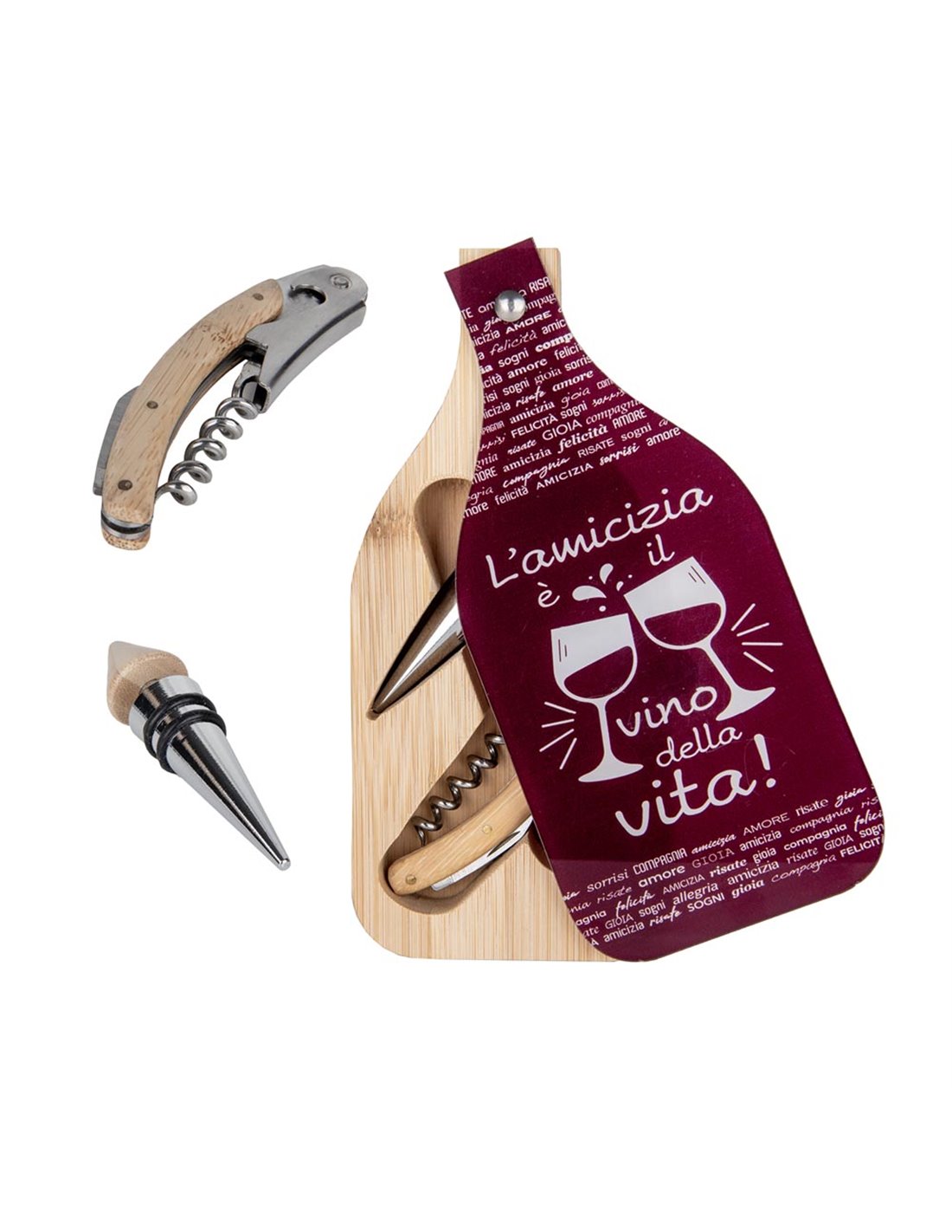 Set bomboniera con 2 pezzi per vino. Nel set è compreso il cavatappi ed il tappo salvagoccia in una simpatica box a forma di bottiglia decorata con la scritta "l'amicizia è il vino della vita".