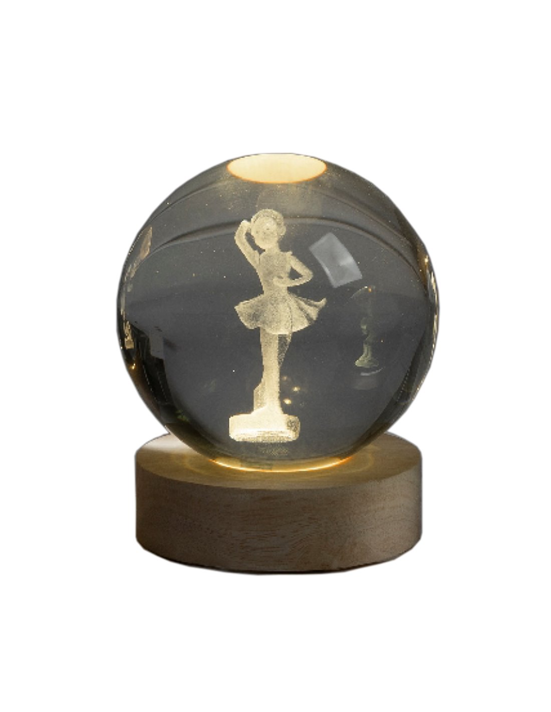 Sfera led illuminata con ballerina su base in legno. Ideale per gli amanti della danza.