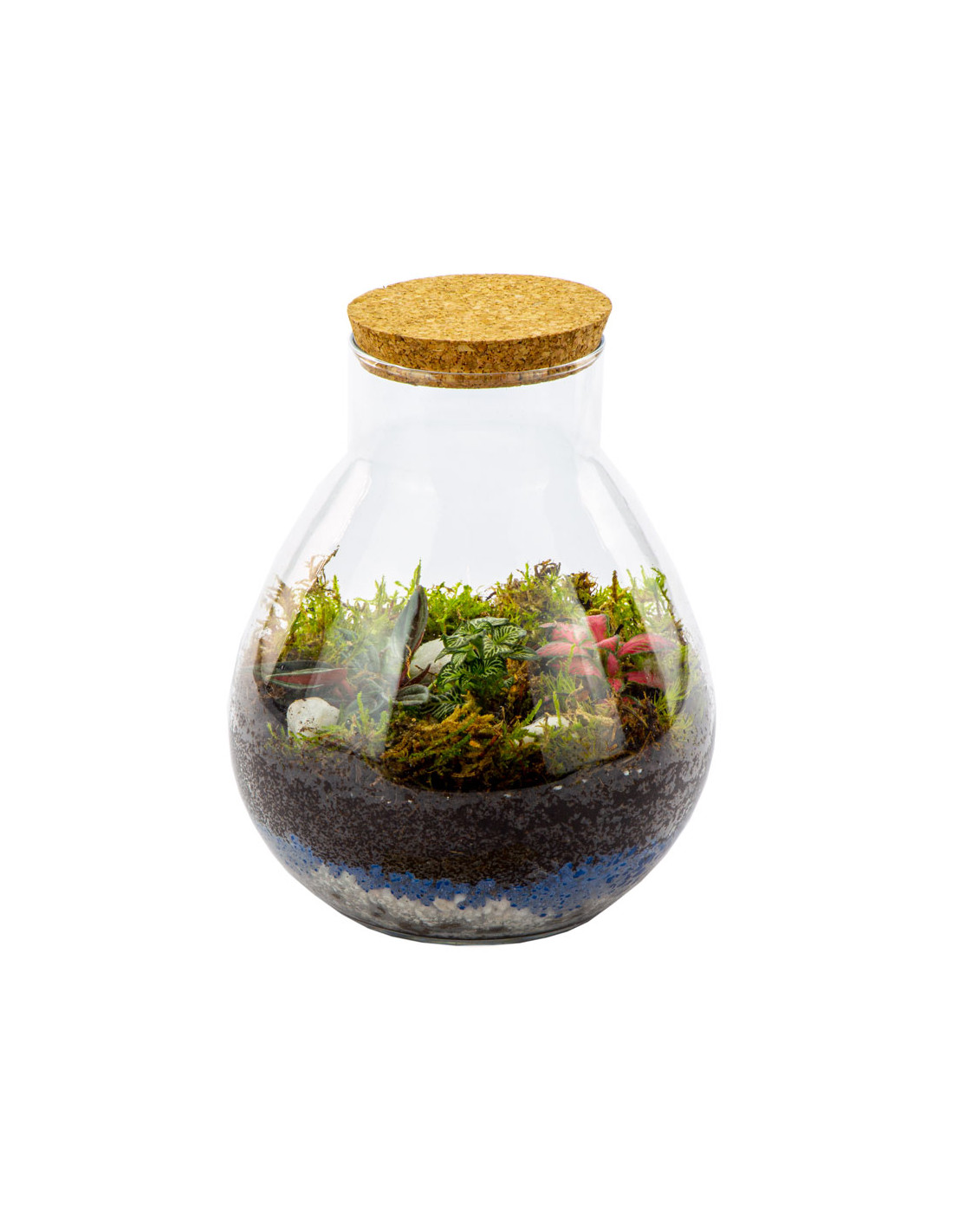 Composizione naturale con piante tropicali come la felce, fittonia e muschio. Il paesaggio naturale è ricreato da diversi materiali come la terra, ghiaia colorata e arricchita da ciotoli e corteccia naturali. Una raffinata ampolla in vetro a forma di goccia con tappo in sughero alto 18 cm con un diametro alla base di 15 cm da ricreare così un piccolo ecosistema perfetto.