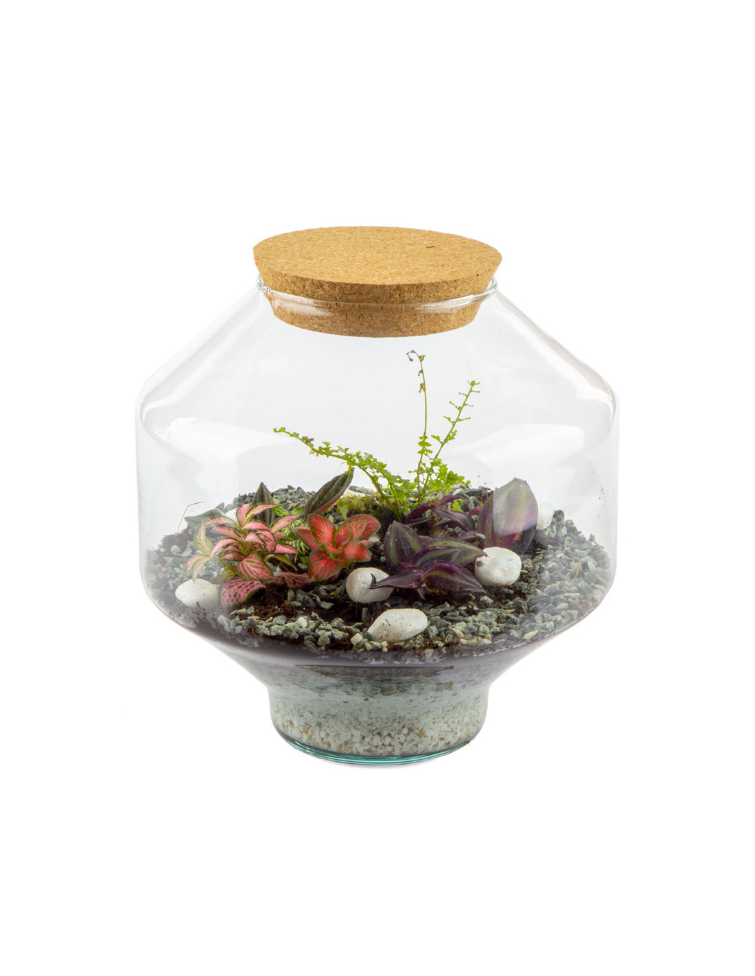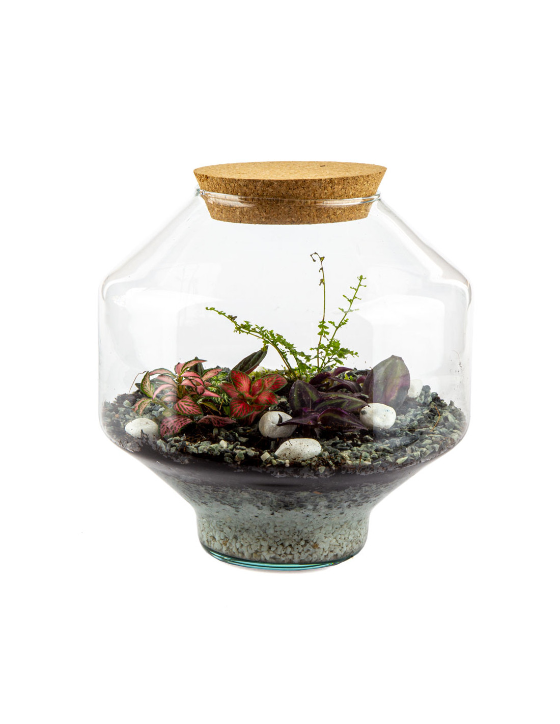 Composizione naturale con piante tropicali come la felce, fittonia e muschio. Il paesaggio naturale è ricreato da diversi materiali come la terra, ghiaia colorata e arricchita da ciotoli e corteccia naturali. Il contenitore in vetro alto 22 cm e del diametro di 22 cm è chiuso con un tappo in sughero da ricreare così un piccolo ecosistema perfetto.